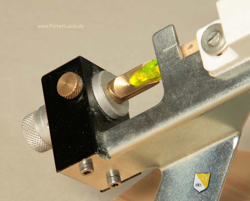 SO 1022die Markierung im Befiederungsgerät steht senkrecht und der Punkt für die Leitfeder kommt nach oben.Achtung, dieses Bild hat einen Fehler: Um es auf sechsfach-Befiederung zu stellen, muss die Achse ein stück weiter hochgeschoben werden. Damit kommt auch der Pfeil höher. Tipp: beginne mit der 2. Feder, dem Hörnchen, weil beim beim Kleben der letzten Feder die zuerst geklebte gegen das Befiederungsgerät gedrückt wird. |